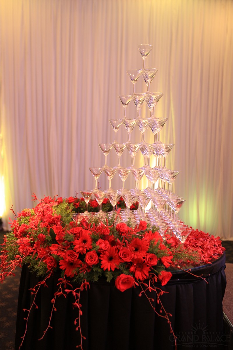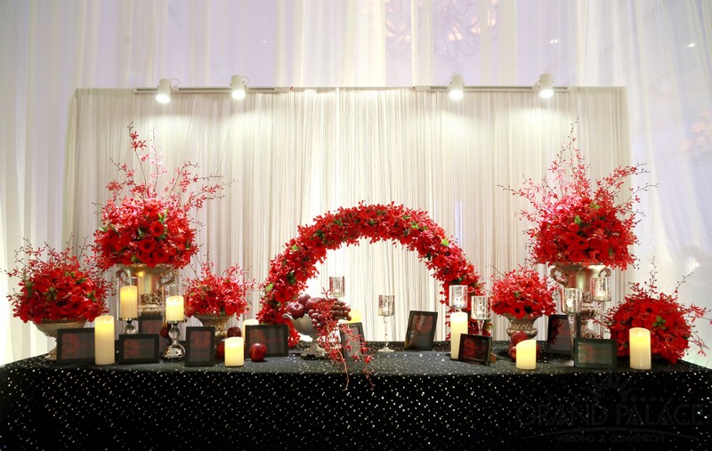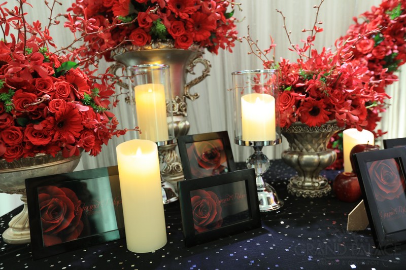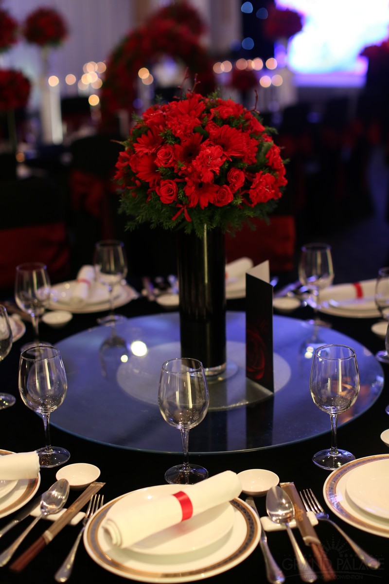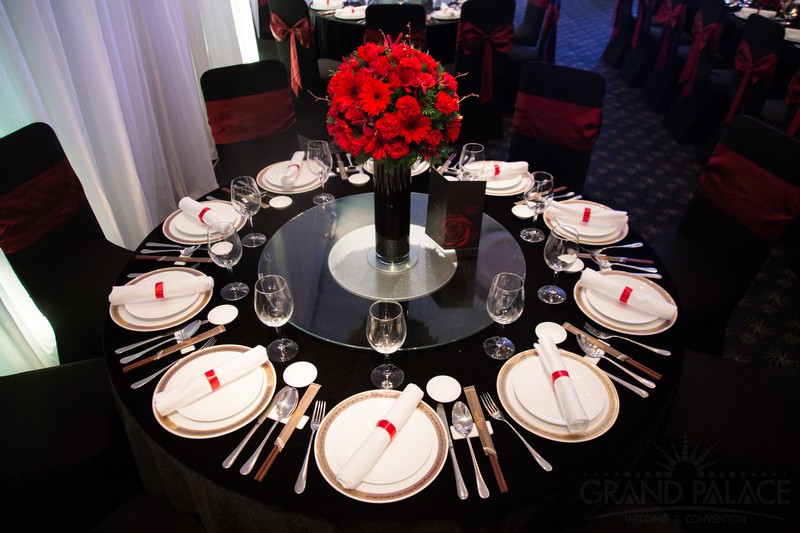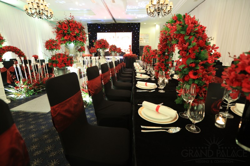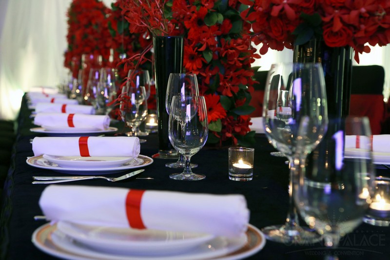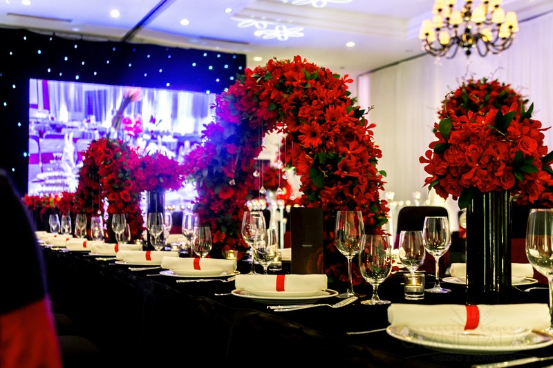 Với 2 màu chủ đạo là đỏ và đen, 2 gam màu tưởng chừng như đối lập, nhưng khi kết hợp với nhau lại tạo ra vẻ đẹp sang trọng, huyền ảo bất ngờ. Gam màu đỏ và đen được đan xen hài hòa, cân bằng, để đám cưới không quá trầm vì màu đen và cũng không quá rực vì màu đỏ. Ngoài ra, hệ thống ánh sáng kết hợp với ánh nến trên bàn tiệc cũng làm đám cưới thêm lung linh hơn.